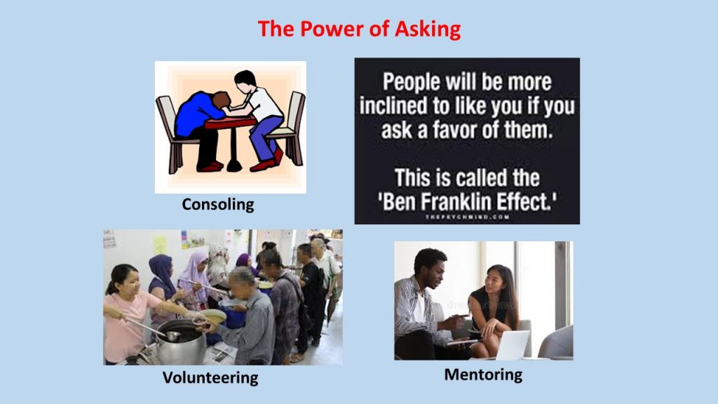 Have you noticed something? After we help, advice, or mentor someone, we tend to like and want to help that person even more. This is called the “Ben Franklin Effect” and is based on the psychological concept of “cognitive dissonance.” I don’t pretend to fully understand it and won’t try to explain it here, but there are numerous observations we can make to substantiate this effect of “People tend to like you if you have asked a favor of them.”