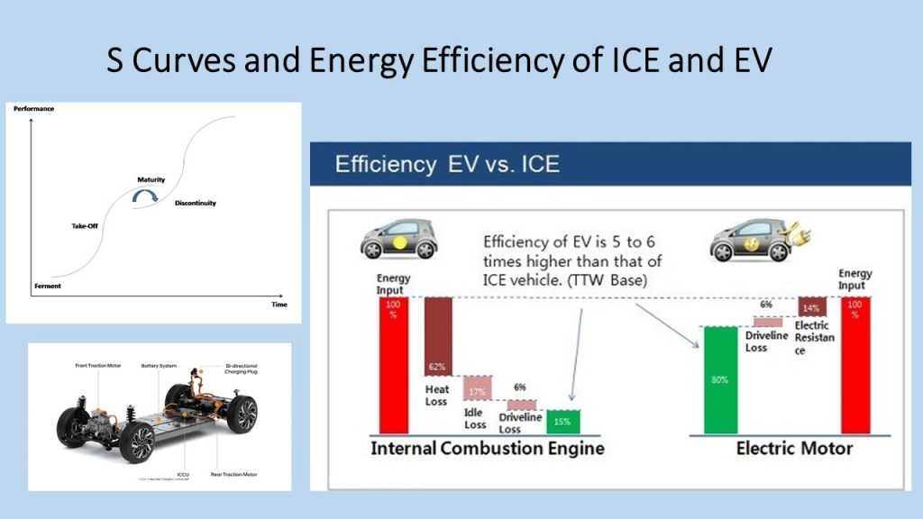First of all, EV is inevitable and is for real. This is caused by multiple factors: the advancement of new battery materials, the diminishing improvement in ICE (internal combustion engines) and transmissions, the ever more stringent emission and fuel economy regulations, and the flexible sources for electricity. ICE technology is approaching the plateau region of its S-curve, while electric technology is rising steeply on a new S-curve. In the years to come, the advantages of EV over ICE in performance and operating cost will widen, hence permanently shifting the auto industry to the new electrification S-curve.