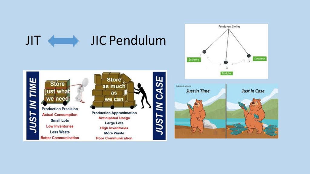 The pandemic has caused the pendulum to swing from JIT to JIC. The conflicts of these two very different systems are causing the current supply and demand chaos. It will take some time for the global system to find the right equilibrium and begin to function smoothly again. Maybe a better system will emerge that is synchronous, agile, sustainable, and utilizes the best AI, automation, 5G, and digital technologies.