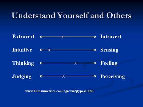 網路上或坊間書籍有提供許多性向測試的方法,可以嘗試用其中一種來看看你自己是屬於哪一種類型。如範例圖中的是MBTI測試,它將人的認知分為四種:是外向(E)還是內向(I)?是實感(S)還是直覺(N)?是理性(T)還是感性(F)?是断定型(J)還是感知型(P)?