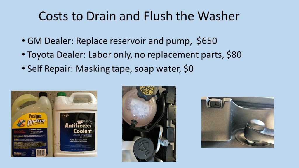 First, I took the Buick Encore to a GM dealer and asked if they could drain the antifreeze and flush the reservoir. The answer was “no” because the fluid is sticky and not easy to clean out. In addition, they thought both the reservoir and motor may have been damaged. Just to be safe, the whole windshield fluid system had to be replaced at a cost of $650. That was a shocker. I decided to see what a Toyota dealer would do on the Toyota RAV4. The technician there took apart the reservoir, drained it, and flushed the system with warm soapy water until it was totally free of antifreeze. The total cost was $80. This is a good example of the difference between the more American approach of “just in case” and “replace instead of repair,” as compared to the Japanese approach of “just as needed” and “minimal waste.” It is sad to see that after decades of “learning the Toyota System,” GM dealers have not yet mastered the lean approach.