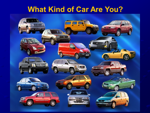 If you are adventurous and fun loving, you might be a sports car with a convertible top to zip through a winding country road. Or, you might be a high performance car with a lot of energy and a daring spirit to take on challenges and competition. Some of you are more like a luxury limo living a glamorous and pampered life. My guess is that most of you are dependable sedans, dutifully carrying out your daily business without much fanfare. Of course there are always those big workhorse trucks and vans who haul stuff and people around with great capacity and heart.