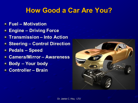 無論你是什麼樣的車,外觀和尺寸都只是你的一部分。要成為一輛好的車或一個好的人,你需要有強大的引擎和驅動力來激勵自己;你也需要敏捷的轉向系統來操作方向(你的生活)。至於可靠的剎車及控制系統,則能幫助你遠離麻煩。而好的燃油就像食物一樣,能讓你更有效率地往前邁進。高複雜的控制器就像大腦般,讓你有能力處理一路上(生活中)所遇到的許多挑戰。清晰的後視鏡和旁鏡就像是你的視覺系統,讓你能觀察周邊環境狀況,還能讓你欣賞沿途風景、甚至對突發狀況進行應對。當然,一個健康的車體(身體),會幫你把身體各部位的”零組件”都完整集結在一起,讓你(整輛車)能保持最佳狀態、繼續快樂向前行!