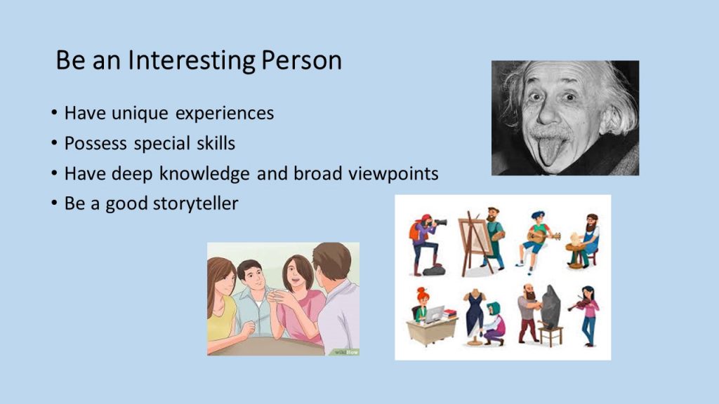 To become interesting people ourselves, we need to have skills, knowledge, experience, and viewpoints to share with others. In many gatherings or conversations, when people just exchange pleasantries and share news items, it becomes a boring event. We’ll remember if someone shows a special vocal or instrumental musical talent, shares a fascinating travel adventure, or gives an insightful analysis of a current event. We learn something, we are entertained, or we are fascinated by a great story. We want to spend more time with such friends and colleagues.