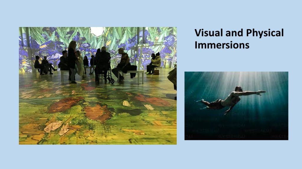 Physical immersion in the water: With the extra time available during COVID, I have rekindled my hobby of daily morning swimming. With every stroke and every kick, I can sense how my body is pushed forward, as the water flows around me. It is a soothing interaction between the water and me. This immersion in water gives me the sensation of a peaceful meditation.