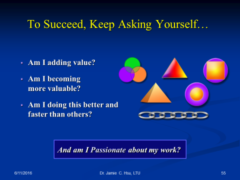 讓自己站在公司老闆、投資者、主管的角度來看,什麼是他們最關心的?他們要的是一位懂得讓自己不斷增值、能博學多聞、可以比別人更快更好貢獻所長的員工。