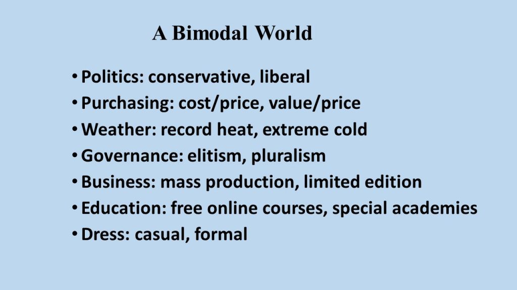 In statistics, we learn that many events and large data tend to follow a normal distribution. The majority of the population or data will fall in the central section, and the average will fall in the middle. That kind of distribution seems to be changing quite a bit in the modern world. Somehow, our lives, our preferences, and even our environment are being pushed to the left and right and forming a bimodal shape of distribution.