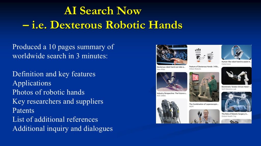 Fast forward to the present, and I am doing some consulting work with several research institutes. The researchers write proposals for areas of value to the company and to society. Out of curiosity, I used an AI tool to do a quick search on the topic of robotic dexterous hands to get up to speed for discussion. Amazingly, the AI tool gave me a ten-page summary in three minutes. The summary included definitions, key features, existing and emerging applications, major researchers in the world, patents granted, and a list of published references. The AI tool even allowed me to interact with it and ask additional questions and request data. What a sharp contrast between the old and new ways of literature search! But questions remain: Are these results accurate and credible? Are we getting the intrinsic learning from a more detailed, laborious manual search? The process of laboring, exploring, learning, and knowledge accumulation may not be as straightforward as gaining and reading a nicely formulated report.