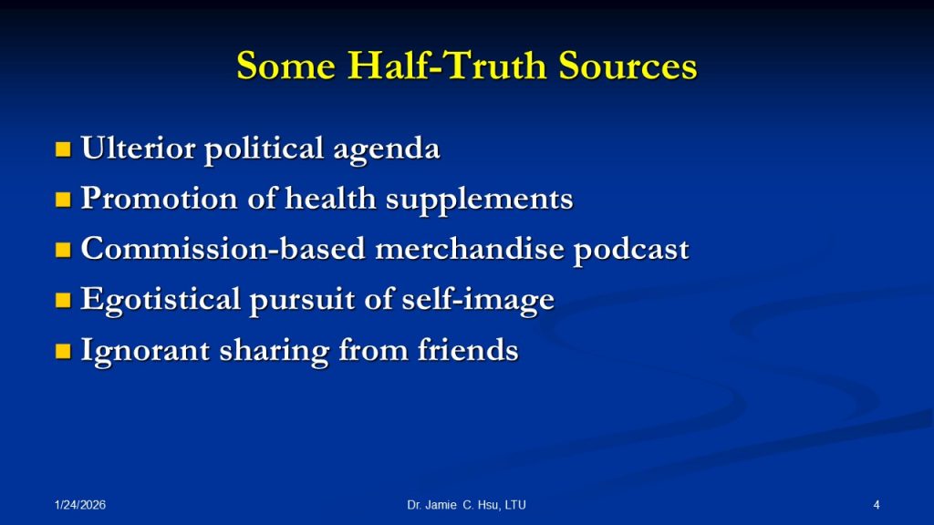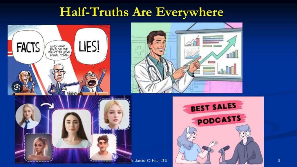 In these days of internet communication, digital media, and AI-generated images, we are bombarded with half-truths, which may appear to be authentic and innocent until we find out the real hidden agenda behind these messages. In the information overflow era, simplicity and novelty often trump nuance and accuracy. Here are a few examples of half-truths commonly seen in the news and the real reasons for the falsehoods.