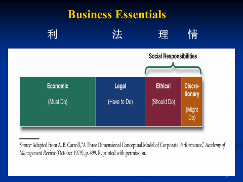 一家成功的企業必須注重四個商業要素:利潤、合法、道德,以及人情。因為企業存在的目的是為了賺取足夠的利潤來照顧投資者、員工、供應商、以及其他利害關係人。沒有足夠的利潤,企業將會破產、員工也會失去工作。但企業應該要賺取利潤到什麼樣的程度?這裡頭存在有法規的限制、也有企業做決策時對於道德標準與相關政策的考量、還有一般公眾可接受範圍內的基本人情。任何業務上的決定都應該以這四個要素為指導原則。