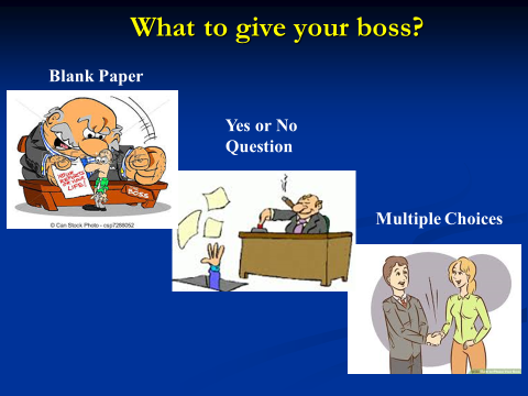 As a consultant to many leaders, and as a leader myself, I have observed one simple axiom over the years. Bosses like well-thought-out multiple choices to help them make decisions.