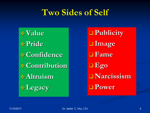 就像是水火的好與壞,在我們的生活中,”自我”的價值可以是有建設性的、抑或是具破壞力的,這取決於要如何對待它。我們對自我的關注,促使我們變好、做好事、建立良好的聲譽。我們都關心我們的自我形象,並且希望能建立、保護它。可惜的是,我們也看到有些人對”自我”過分的關注,充斥著自大、追求名利。這樣的人存在於職場、政治、休閒娛樂業、甚至日常生活中。他們陷入了尋求宣傳、名聲、自我權力的輪迴循環中。最終,他們周遭只剩下對他們唯唯諾諾的人、卻失去了真心的朋友。
