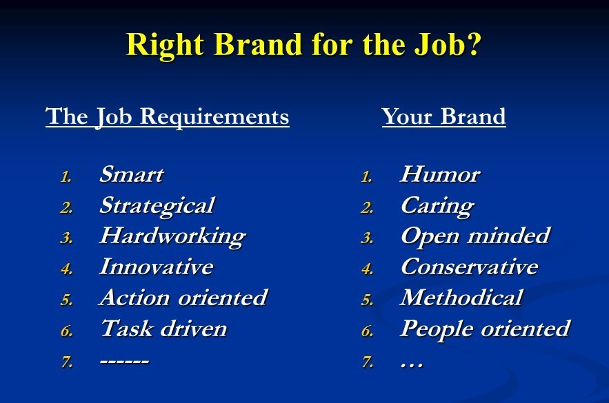 Whether you like it or not, that is your brand and the public you. You may have a totally different view of yourself, but perception is reality. People will treat you the way they think you are. Your job seeking and career moves are influenced greatly by your brand and how well that brand matches the job requirements and attributes.