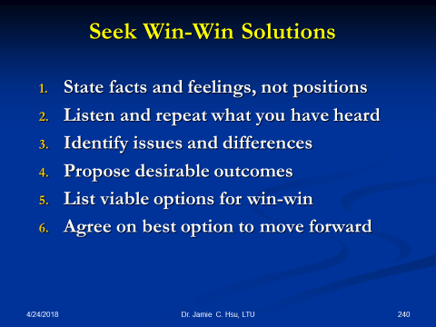 We all encounter conflict in our lives. It may be with a child, spouse, friend, colleague or boss. Such conflicts, when not handled right, can cause unpleasant arguments, bruised egos, or even long-term hurt feelings. When conflicts arise, most people either get angry and fight, or get sad and flee. Not too many people have learned how to turn such disagreements into win-win solutions.