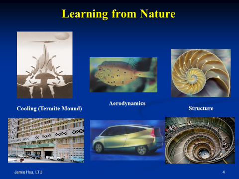 人類長時間以來,一直在努力向大自然學習。飛翔的鳥兒激起了飛機、滑翔翼、甚至是前衛飛行服裝的發明。隨著儀器、數學及電腦的出現,讓我們更深入地了解大自然是如何運作、進一步幫助我們去設計一些非常具有高效能的建築、車輛及承重結構等。我們舉例來說: