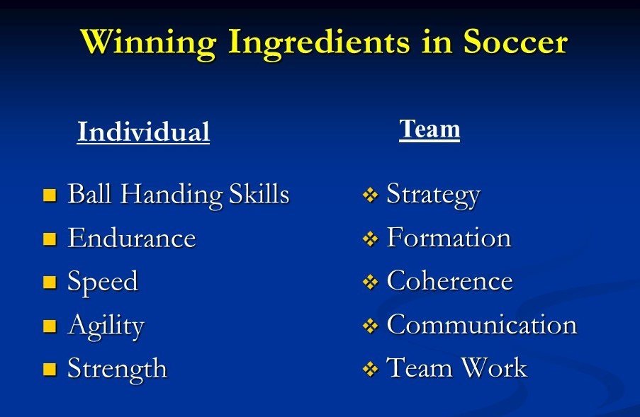 要贏得比賽,除了個人技巧外,團隊也必須要有良好的戰略、團隊合作、友情及卓越的溝通。觀看一支球隊傳球、穿越防守並且射門得分,是一種享受。經過多年的練習與合作,選手們可以有默契輕鬆自如地調整互動,如同是一個身體各部位一樣的和諧。
