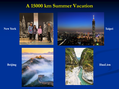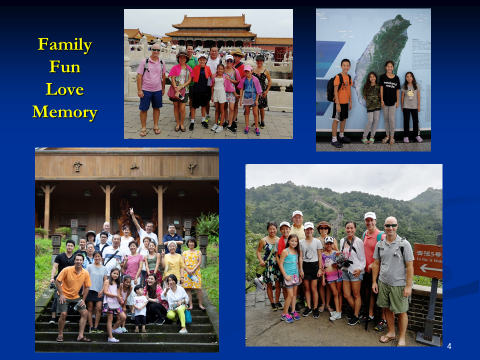 這是第一次我的女兒們、女婿們、還有孫子們來到台灣及北京。儘管是在炙熱的夏季,大夥兒仍然度過了一段美妙的時光。我們參觀了台北市區、林家花園、101大樓、故宮博物館、佛寺、太魯閣、長城、北京動物園、紫禁城、以及許多其他相當有特色的景點。