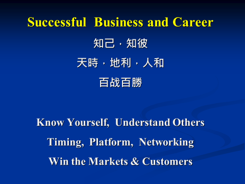 Win the markets and customers (百战百勝): With the above 5 key ingredients in place, you can pick the right battles to fight. Select the appropriate markets and customers to focus on. Then you can win the war of business and career ascent.