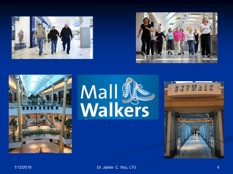 為了增加我自己日常運動的多樣性,我決定嘗試在購物中心健走,尤其當天氣太冷又下雪,無法在戶外運動的時候。這對我來說,無異是個嶄新有趣的體驗。在每天步行1萬步的過程中,我遇到了各式各樣的步行者,有老的、小的;男的、女的;一個人走的、一群人一起走的。最有趣的,是看到每個步行的人走的都不一樣。這也讓我想起了醫生跟治療師對於如何正確走路,才能避免引發背部及腿部疼痛的建議与教導。一個人若要透過適當的步行來改善健康、姿勢及耐力,就需要經過觀察、學習與用心實踐的過程。