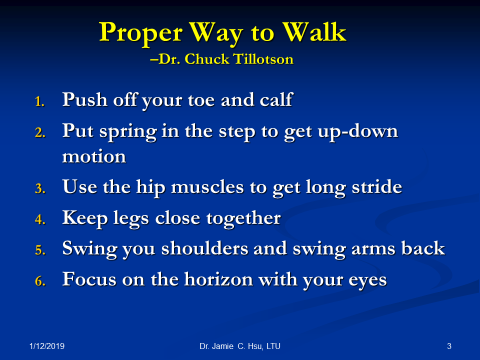 Learning: Good advice on how to maximize the benefit of walking is provided by Dr. Chuck Tillotson. The highlights are summarized in the accompanying chart.