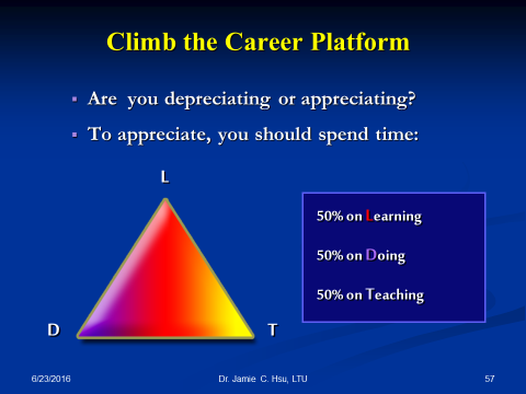 The best job is the one that allows you to do the 50-50-50. Try to maintain the right balance. “Doing” 100% of the time means you are consumed by the routine work. “Learning” too much means you are still a newcomer. “Teaching” too much will give you a reputation as merely a talker. The right balance will help you reach the next platform and your career aspirations. In a 30-year career, climbing 10 platforms of “Do-Teach-Learn” with 3 years on each, will give you a fun and rewarding career.