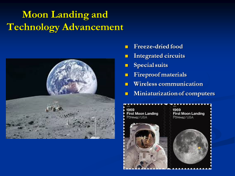 也因為登陸月球以及其他的太空計畫,許多技術在此之後也得到了加速發展與應用。最引人注目的,包括冷凍食品、晶片、IC以及電信,它們徹底改變了人們的生活。