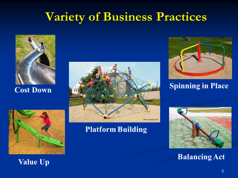 As a company goes through various business cycles and competitive threats, it is essential for the leaders to go beyond the choice of cost down or value up, and to employ all the proper innovation tools. Only by having the trilogy of innovation can a business have both short-term and long-term success.