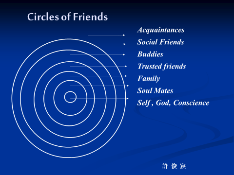 如果你夠幸運,你會擁有最裡層,更深的兩個圈圈。有幾個“知己”深交,比你自己更了解自己,能沒有半點埋怨地去支持你、不求回饋的幫助你、無條件的照顧你。最後一圈是你自己,透過內心的“良知”、或心中的“神祉”,讓你能活出自己的價值、給予內心平和與寧靜。