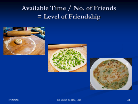 我們每個人都會有朋友,特別是在這個社群媒體世代,無論是在Facebook, WeChat, Line, Twitter, email, Instagram等等,我們的通訊錄上的名單似乎不斷在增加中;不僅如此,我們還透過別人按”讚”的次數,來衡量自己受歡迎的程度。但,這樣真的是在交朋友嗎?彼此之間有因此而發展更深刻的友誼嗎?還是我們把”社交圈”擴得太廣,搞得自己分身乏術、疲憊不堪?(就像桿蔥油餅的餅皮一樣,把麵團鋪的越廣,餅皮就變得越薄)