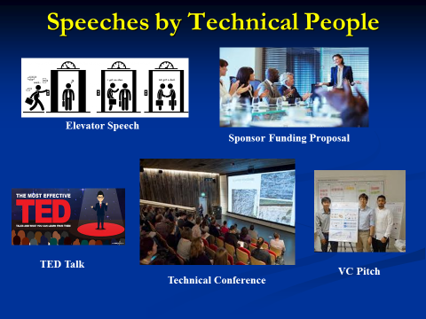 To achieve success in a project and address various technical and business objectives, a person needs to be able to make 5 different types of speeches: Elevator Speech, TED Talk, VC Pitch, Commercialization Proposal, and Tech Conference Lecture. The key characteristics of each of the speeches are summarized in the accompanying table.